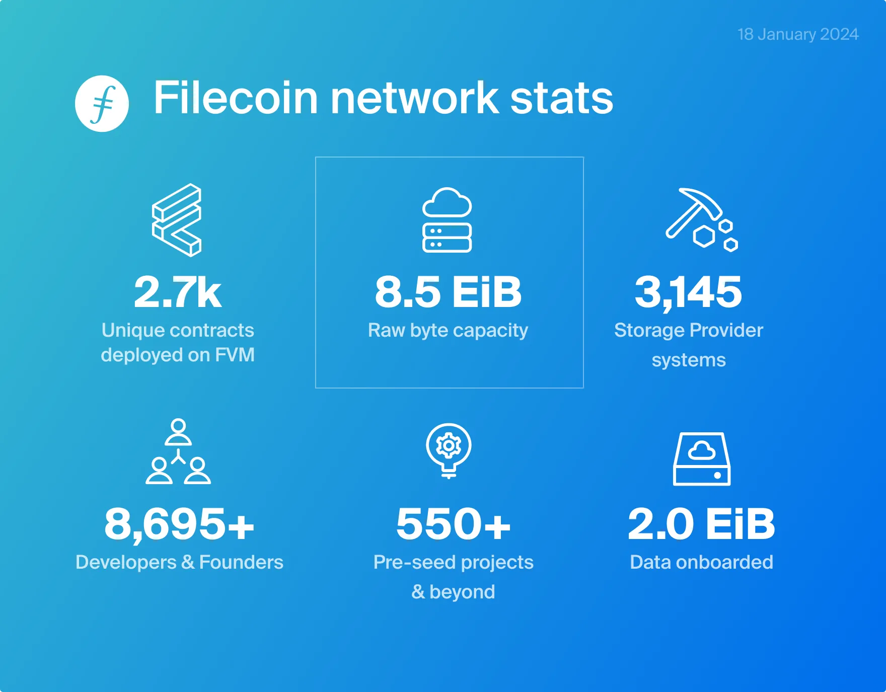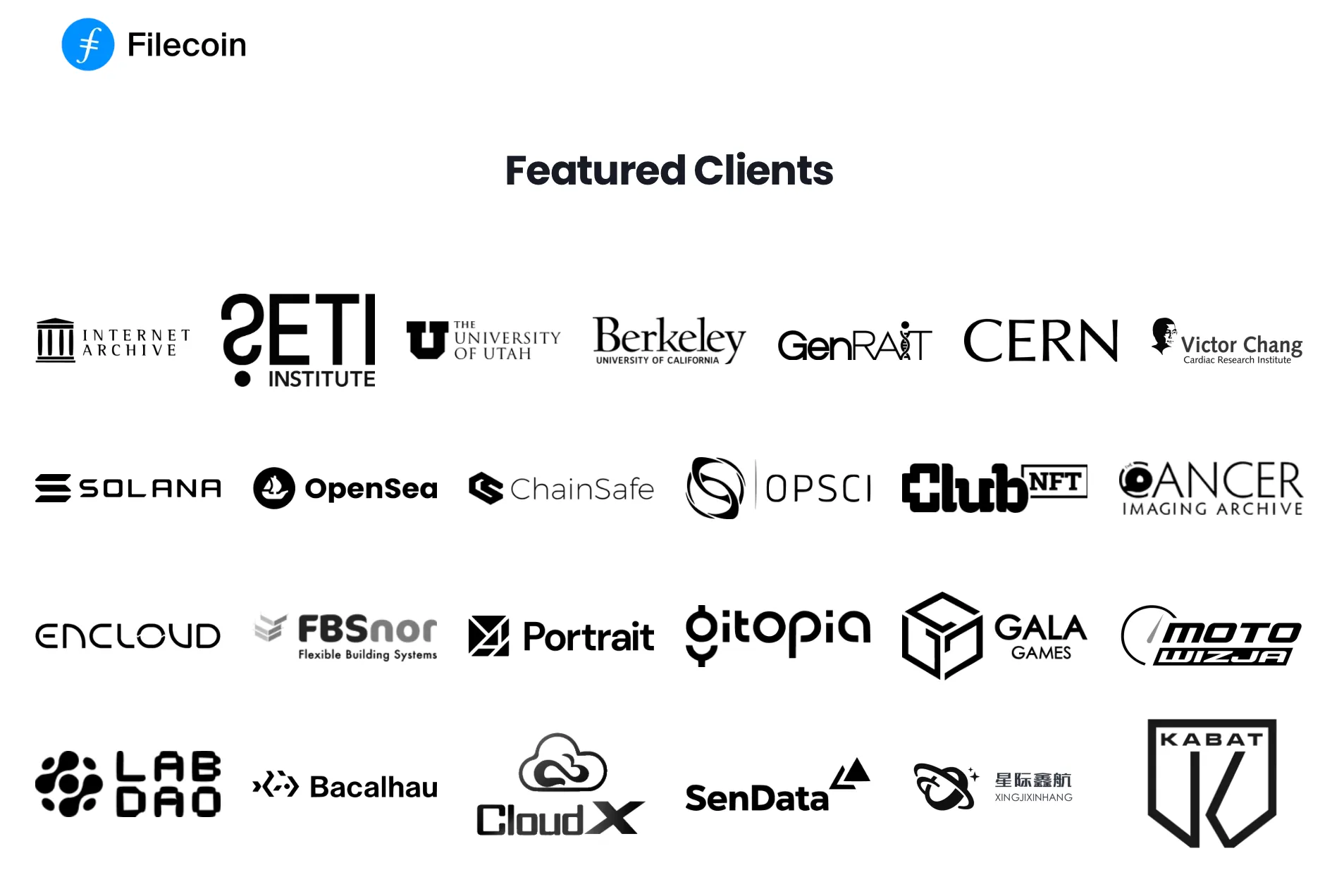 - Storage Growth: Another major goal of the Filecoin network is to onboard and safeguard humanity’s data. In contribution to that goal, since January 2023, total client data onboarded has quadrupled and grown 19x in the last 18 months totaling 2 million terabytes of client data stored on the Filecoin network. Behind that data, are over 1,850 clients that span research, higher education, nonprofits and web3 organizations, such as UC Berkeley, the USC Shoah Foundation, Solana, and CERN. Considering the progress made, in 2024 Filecoin client adoption is ready to cross the chasm into the mainstream market including enterprise, SaaS, and AI clients.