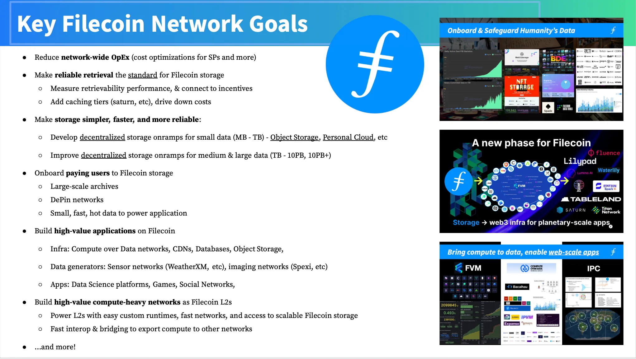 - Especially with the proliferation of generative AI and compute networks specialized for ML inference and training - we expect to see many more specialized compute networks harnessing Filecoin data storage along with FVM and IPC building blocks.