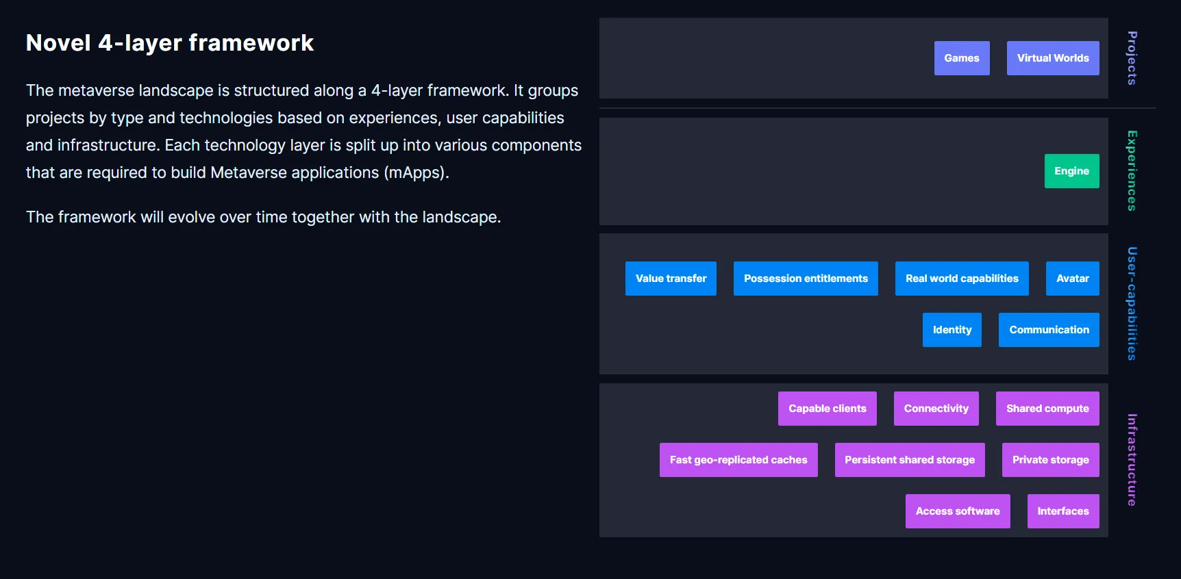 Each technology layer is required to build metaverse applications. However, the framework used in the landscape is a living one and will evolve over time as the ecosystem does.