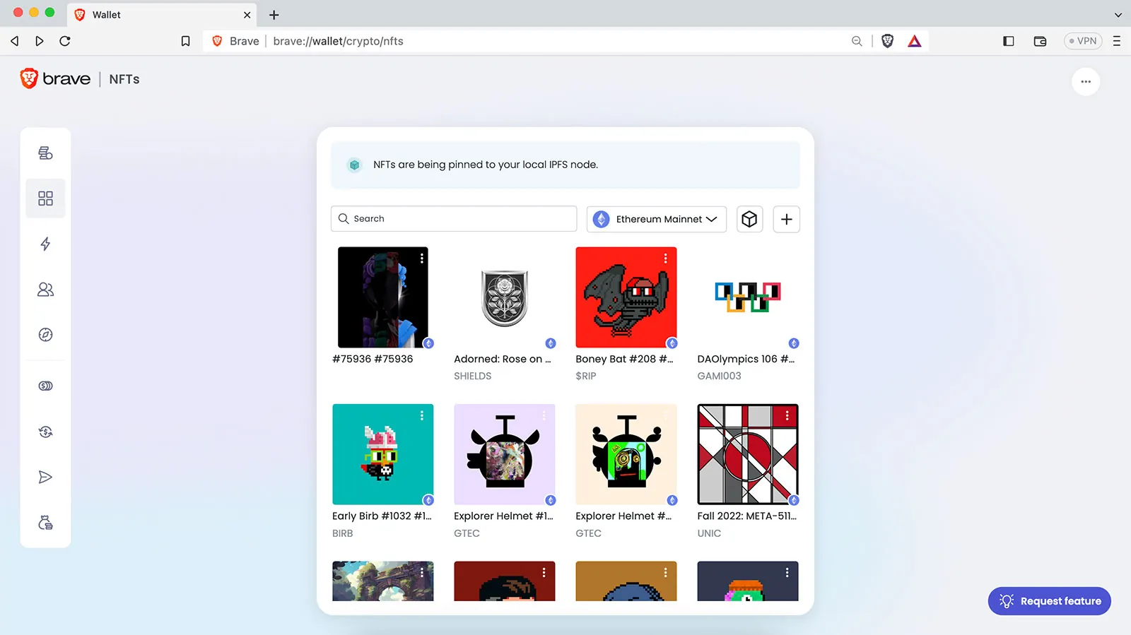 Even with no knowledge of IPFS, Brave Wallet users can avoid the permanent loss of NFT metadata and gain peace of mind by pinning their NFTs locally in their browser. This ensures users have a copy of the assets and metadata for their NFTs, and can make them available to the broader network. Enabling IPFS in Brave is simple and can be done in a matter of minutes. Once set up, eligible NFTs will automatically be pinned. It’s important to note that this doesn’t mean pinned NFTs gain additional protection from hacking or theft, but rather that the data associated with them is kept online through multiple distributed copies.