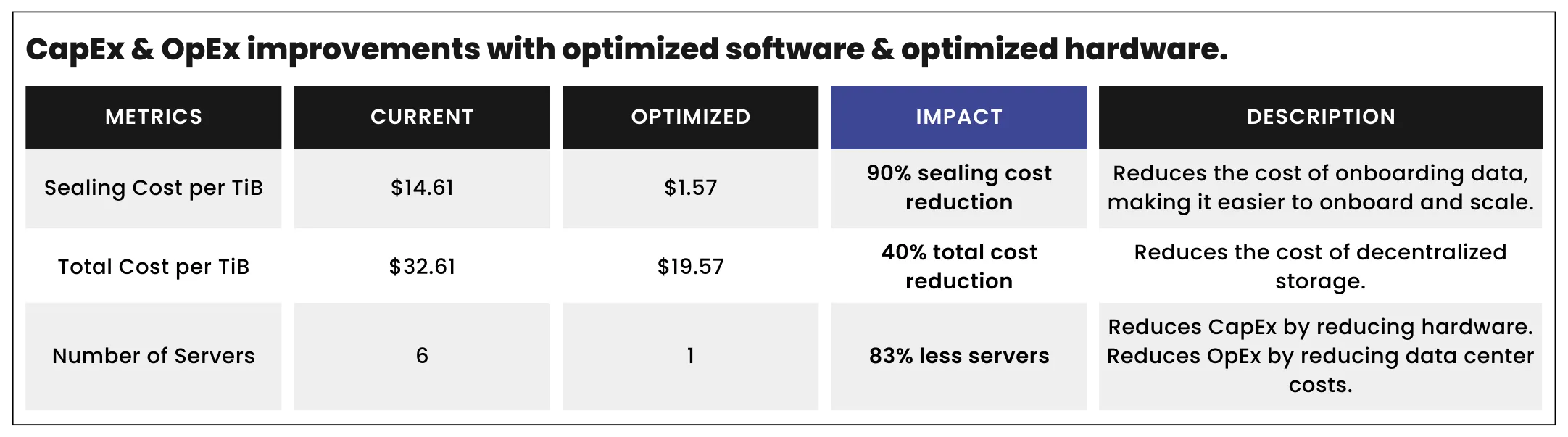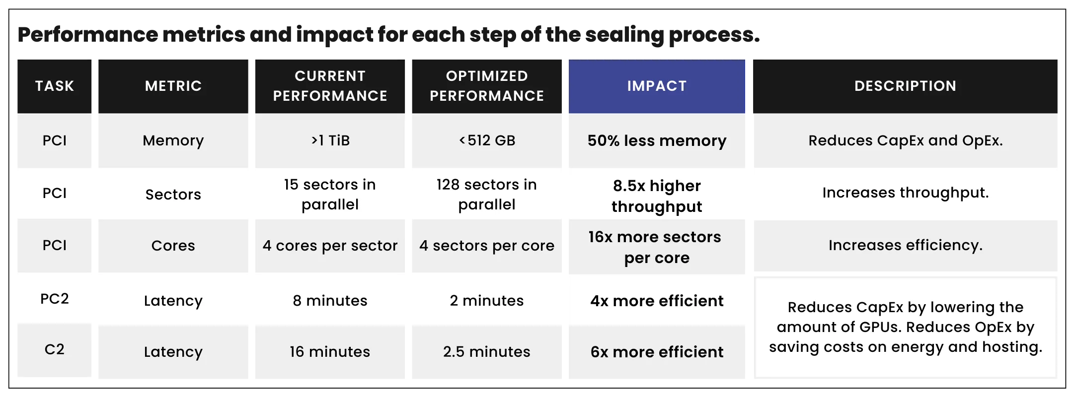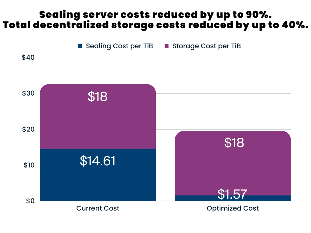 We are pleased to introduce the new software optimizations along with optimized hardware reference configurations. The impact on Storage Providers will vary based on individual hardware and setups; nevertheless, the entire ecosystem can anticipate improved performance and reduced costs with 75-85% increased throughput to PC2 and C2 that will be integrated directly into Lotus. The new optimized software with optimized hardware reduces sealing server costs by up to 90% for Storage Providers, leading to an up to 40% overall cost reduction to decentralized storage. As an example of cost savings, it used to cost over $200,000 to purchase sealing servers to seal 20 TiBs per day. It will now cost under $25,000 to seal 20 TiBs per day. Furthermore, Storage Providers will benefit from a noticeable reduction in operational costs as a single server can now efficiently handle all sealing tasks, achieving a remarkable 6x+ higher throughput.