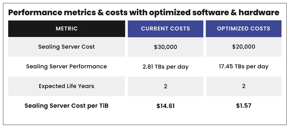 The Filecoin Network relies on computations performed on the data being onboarded in order to ensure network security and enable cryptographic proving, verifiability, and data immutability. However, the hardware required to execute this process, known as "sealing," often accounts for more than 50% of the total hardware expenses. This poses a challenge for new Storage Providers aiming to join the network and for existing ones seeking to enhance their data onboarding capacity. To address this issue, we are excited to announce the release of new software that optimizes data onboarding for the Filecoin network, resulting in sealing server cost reductions of up to 90%. By leveraging this software, network participants can benefit from decreased compute costs while experiencing increased compute power. Please see below for a breakdown of cost and performance metrics calculations. Although the benchmarks are for CC, we expect to see similar results for non-CC as well.