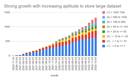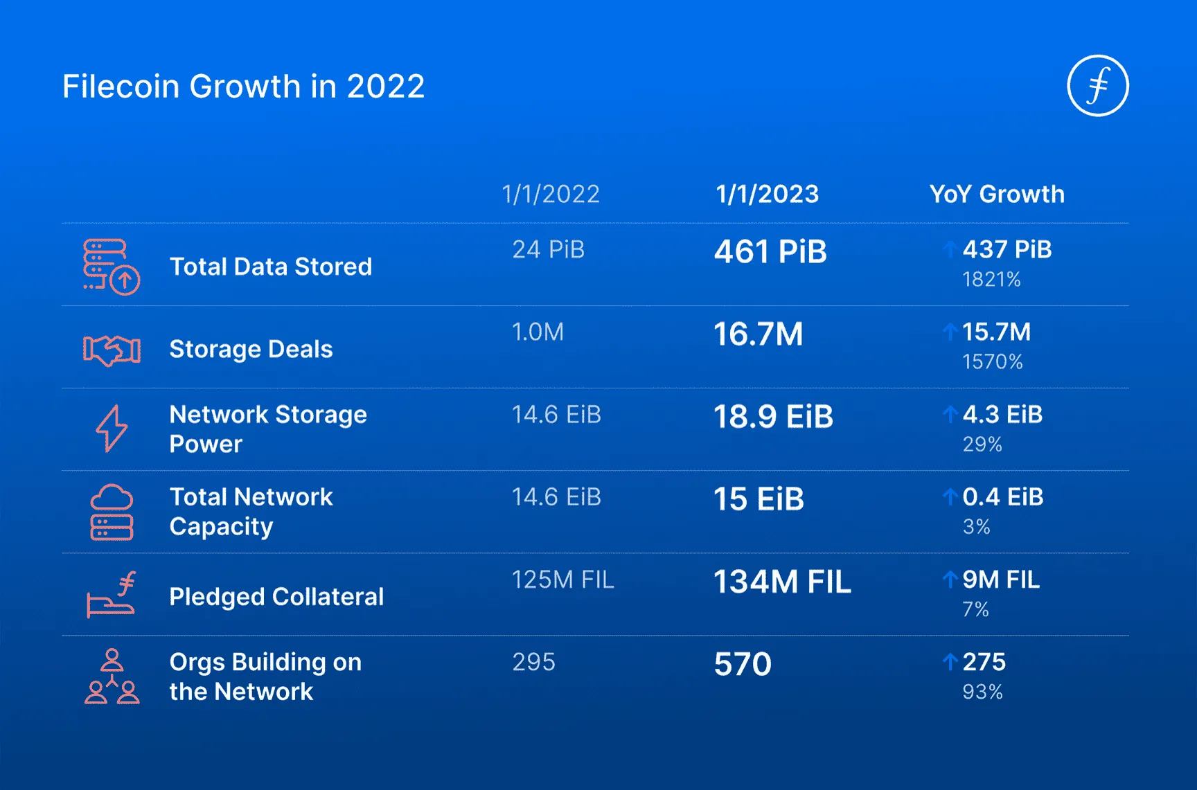 - In terms of network utilization, client data stored on the network is up 16x in 2022 to >400PiB, with 13.9M active deals across tens of thousands of users, including new partners, like MagicEden, Rarible, Kitsumon, and Peeranha and large Web2 datasets from universities like UC Berkeley and USC, and the City of Philadelphia