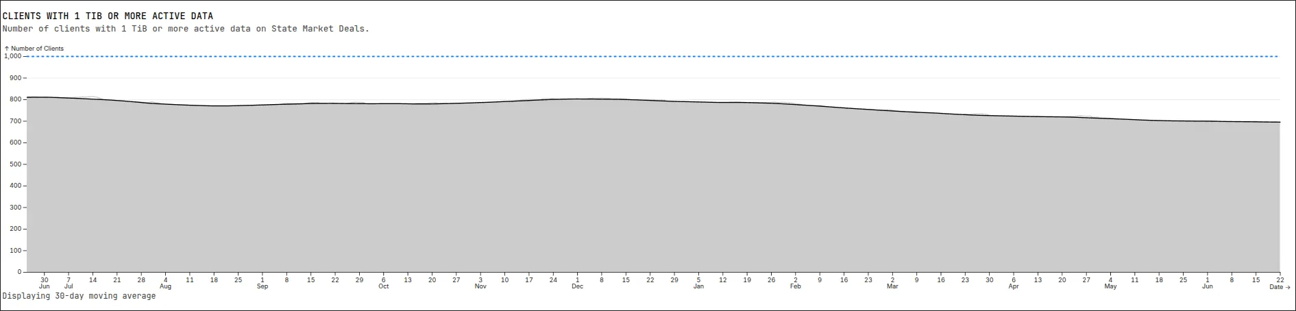- This metric counts unique client IDs that maintain more than one tebibyte of active data on the network. 1 TiB has been chosen as a baseline as it covers most of the clients that interact with the protocol while removing the noisy ones. The calculation identifies deals that are active at any point in time by ensuring the sector has started and hasn't yet ended or been slashed.
