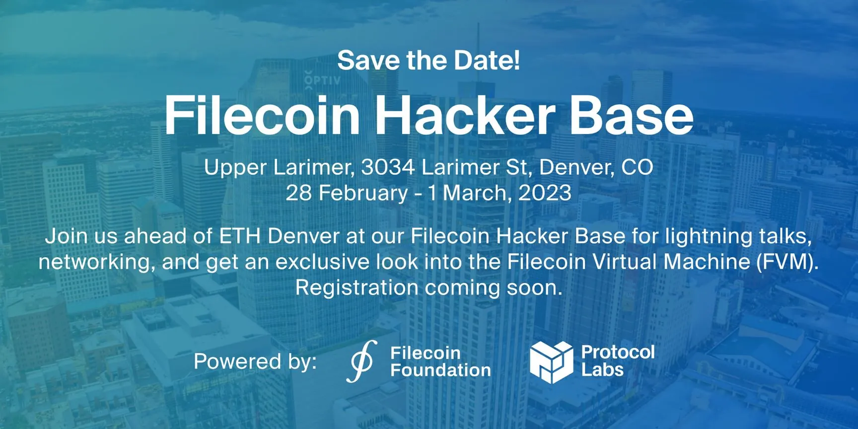 The Filecoin Hacker Base is coming to ETH Denver February 28 - March 1. The base will highlight lightning talks, networking, and showcase an exclusive look into the Filecoin Virtual Machine. Registration is opening soon! Send any questions to events@fil.org.