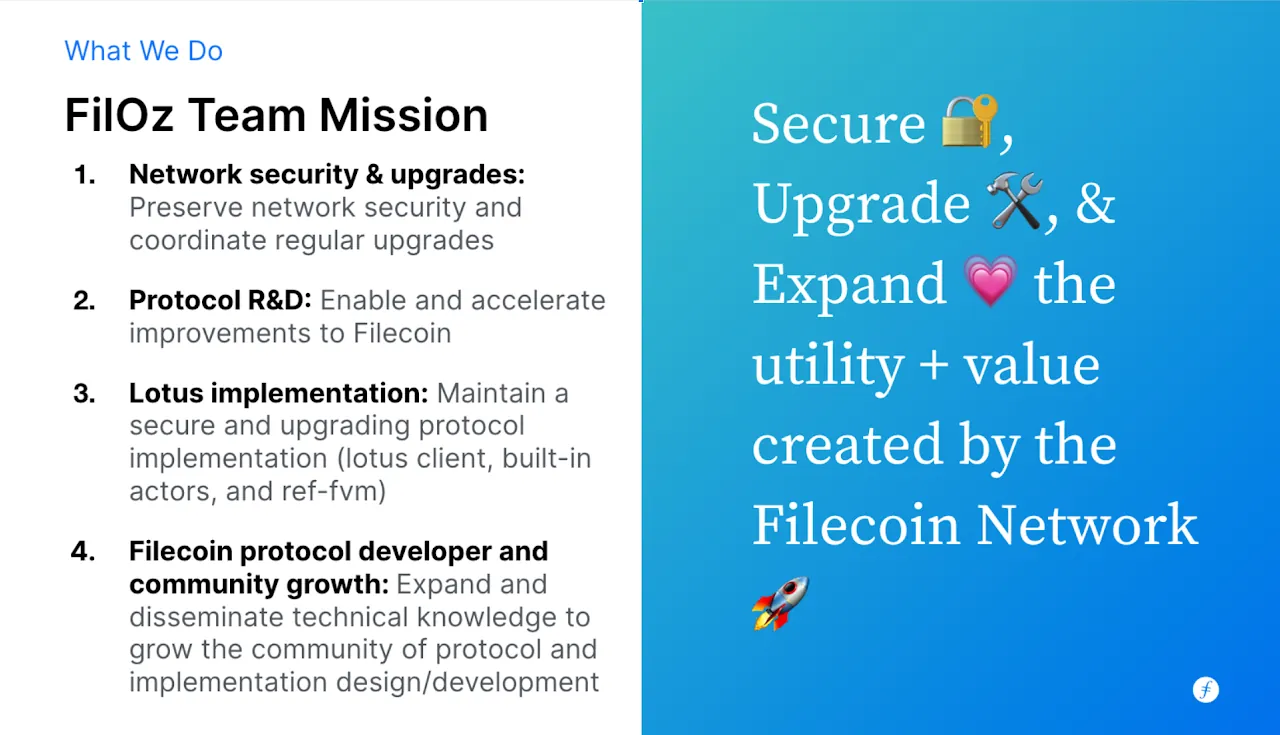 At FilOz, our mission is to secure, upgrade, and expand the utility and value created by the Filecoin network. We focus on shipping high-leverage protocol improvements, supporting network upgrades, maintaining critical open-source software like the Lotus client, and designing new protocol enhancements through Filecoin Improvement Proposals (FIPs). Our goal is to drive innovation, growth, and collaboration within the Filecoin community and make Filecoin better together.