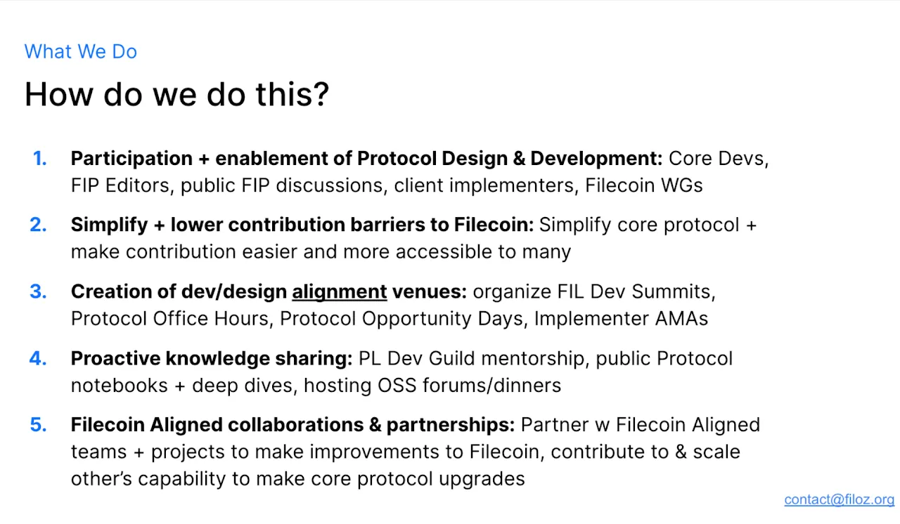 We achieve these goals by actively supporting protocol design and development, lowering the contribution barrier to core protocol/client implementations, helping organize events like FIL Dev Summits, and engaging in proactive knowledge sharing to grow new contributors.