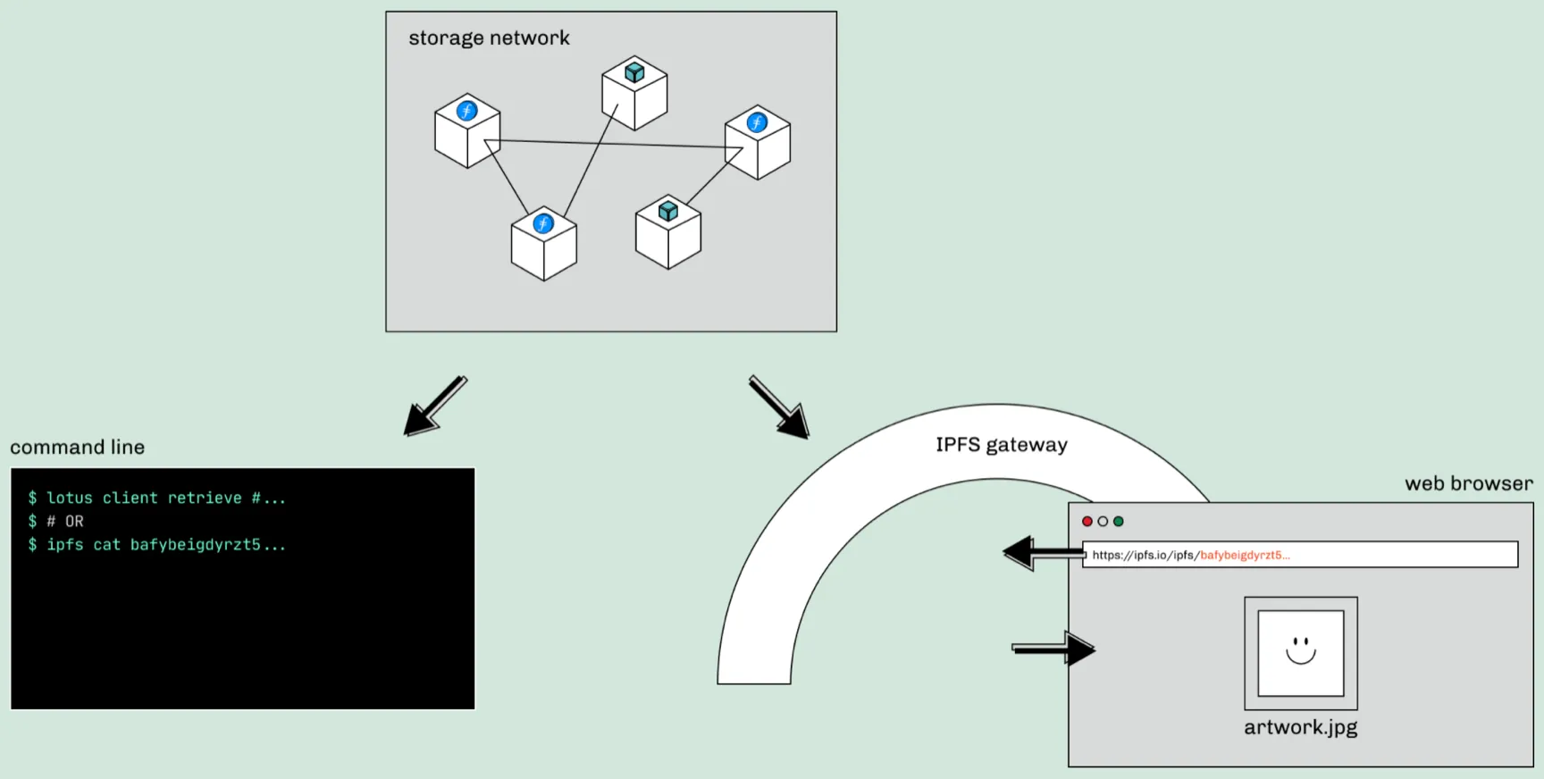 The solution is content addressing. Content-based addressing allows you to access data based on a unique fingerprint of that piece of data; no matter where it is stored, if you have that unique fingerprint of the data, you should be able to retrieve the content. In content-based addressing (within the context of IPFS), content is no longer retrieved from single locations on the web. Rather, content is retrieved from any participating nodes on the IPFS network that have the content you’re requesting. Pieces of content are shared by many parties, and content can always be retrieved either entirely from one node (such as a pinning service node) or collected in bits and pieces from multiple nodes.