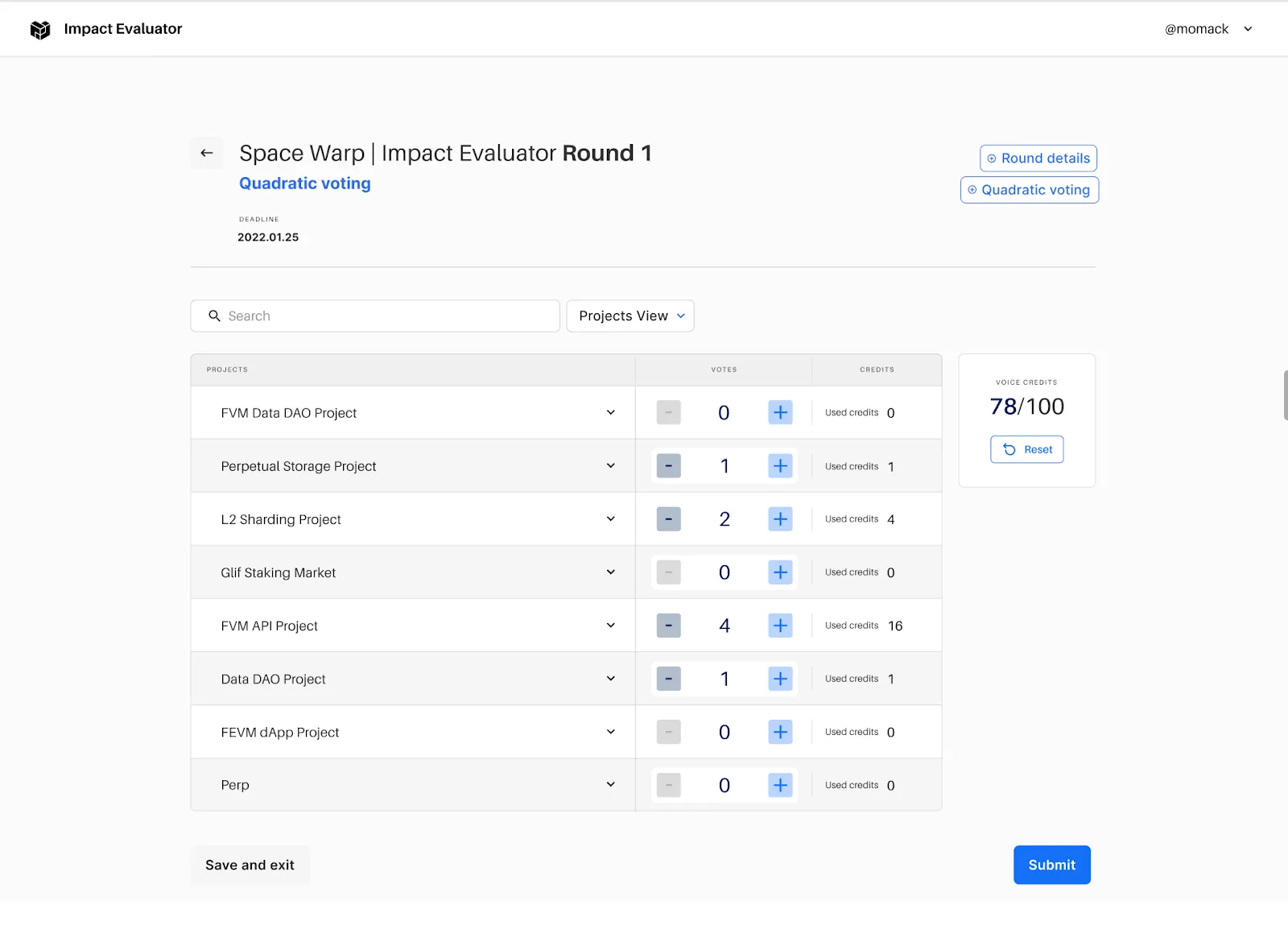 For Space Warp, which is Filecoin’s program for ramping up developer activity leading up to the FVM mainnet launch, Impact Evaluators give builders and subject matter experts the ability to identify and recognize impactful projects sourced from the community. As explained in the Overview & FAQ page, builders can submit a project, sign up for Protocol Labs’ internal Impact Evaluator tool, then allocate a fixed number of “voice credits” toward the projects they believe have created the most impact in the past one month using quadratic voting. These voice credits convert into “counted votes” according to their square root, meaning that one voice credit put towards a project equals one vote; four credits equal two votes; and so on. Simply put, quadratic voting gives evaluators in a round an ability to signal a strength of conviction in the work they find most valuable, noting that evaluators are unable to vote on their own projects.