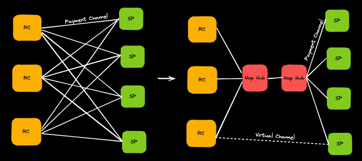 On the right, we envisage a set up where RCs and SPs create a one-off payment channel with their favourite “Hop Hub” (a.k.a. payment channel provider). The hop hubs then all have payment channels with each other. From this setup, we are able to set up an off-chain virtual channel between the RC and the SP. After making this virtual payment, we can reconcile the payment by shifting payments around the three collateralised payment channels. This dramatically reduces the number of on-chain payment channels and results in no on-chain transactions before a payment to a new SP.