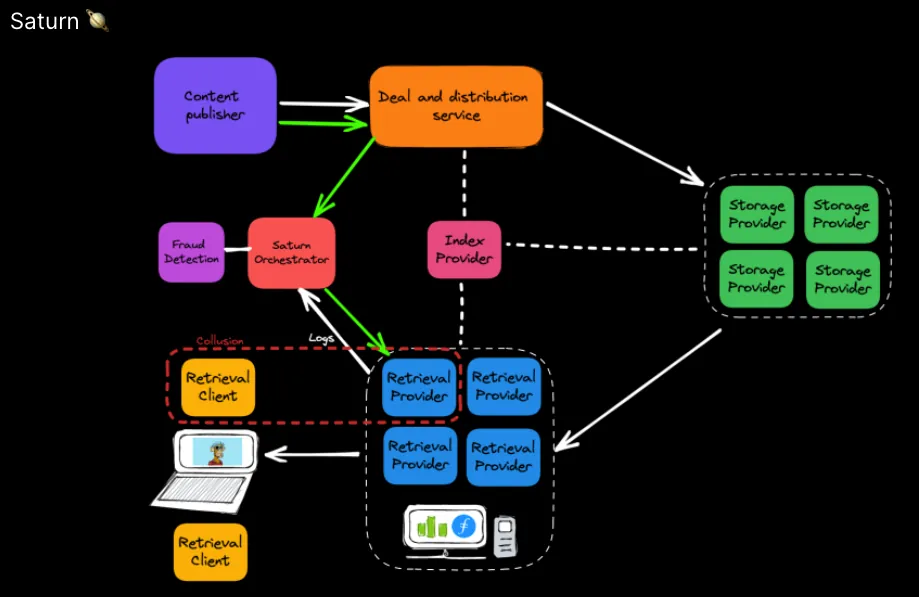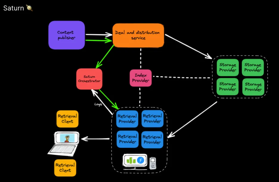 In H1 2022, Protocol Labs began work on the Saturn network. This network has two levels of RPs, L1 caches and L2 caches. The L1 cache node is the retrieval client’s entry point to the Saturn retrieval network. It uses Nginx under the hood. The L2 cache nodes sit as the next cache layer behind the L1s. L2s are designed to run on home computers in home networks, lowering the hardware requirements to join the wider Filecoin network. L2 is built with libp2p, and written in Golang.