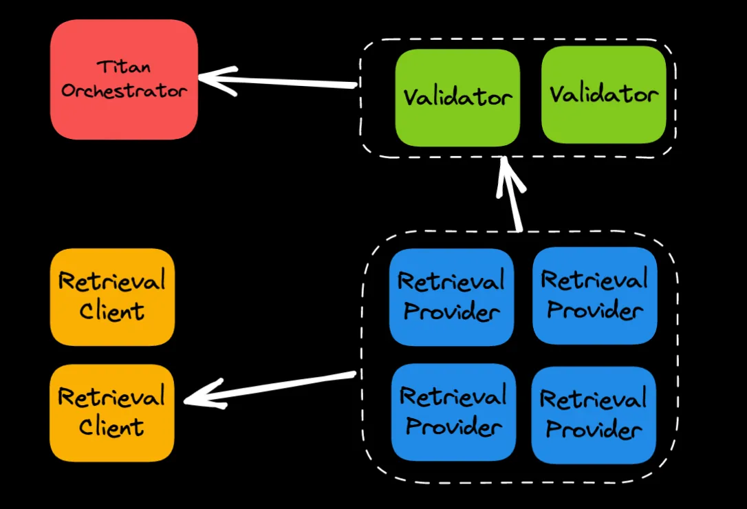 New Web Group is working on a retrieval network called Titan Ultra. The team has opted for a different approach from Saturn for proving contributions in the network. In the Titan network, there are validator nodes who perform retrieval tests against the RPs and report these tests back to an (initially) centralised orchestrator.
