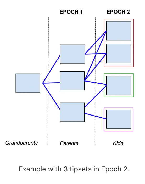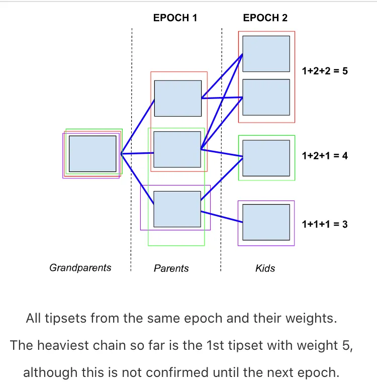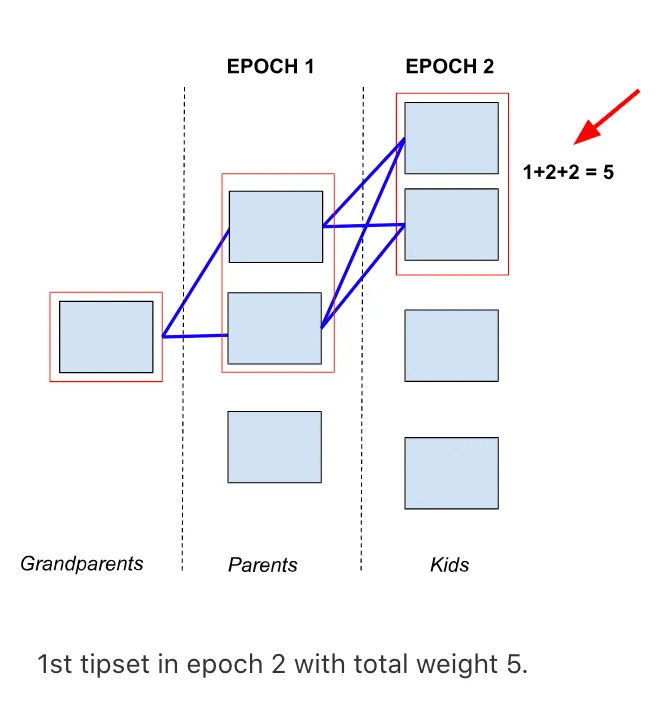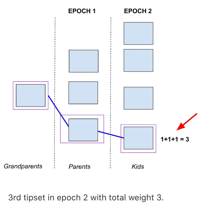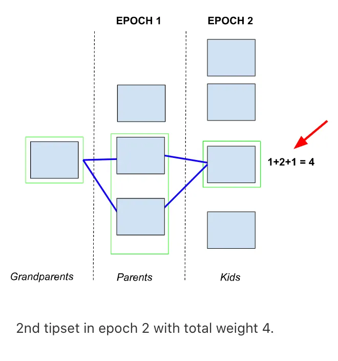 In the first chart below, grandparents + parents + kids gives the first tipset in Epoch 2 a total weight of 5.